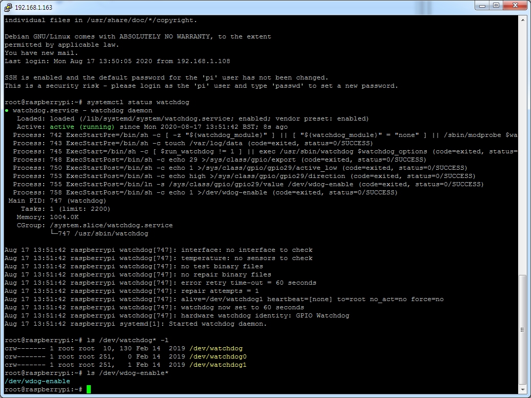 integrated into the Raspbian kernel and OS there are pre-built utilities for configuring and managing watchdogs, in this example we will show how to configure the OS such that a file's last update timestamp will trigger a watchdog time out.