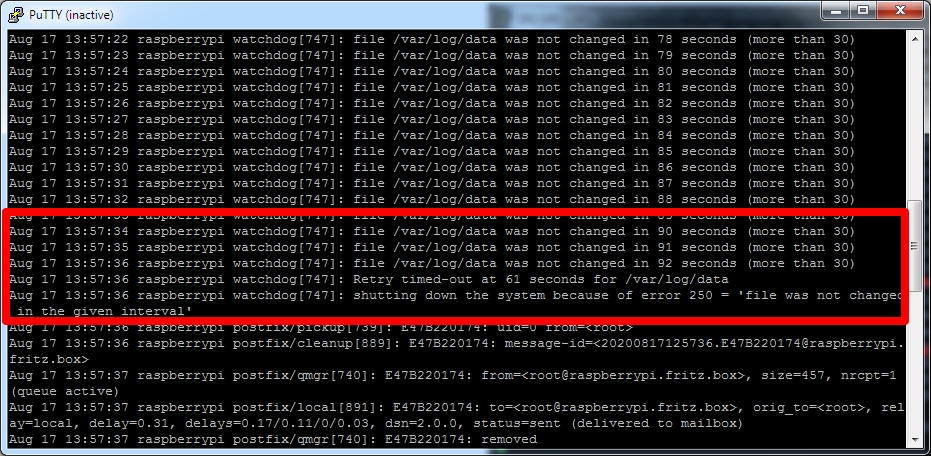 If the file we have configured as the test for watchdog time out is not written to for a period of 3 x the change value (in seconds) then the system will attempt a managed restart, by shutting as many services down as possible etc and then stopping the watchdog timer, causing a hard reset